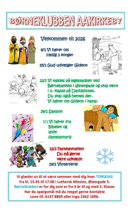I Børneklubben i LM Aakirkeby er vi ca. 20 børn fra 4 år til og med 2. klasse. Vi mødes hver torsdag eftermiddag. Vi begynder med at hygge os med saft og kage. Vi elsker at synge, til god musik.